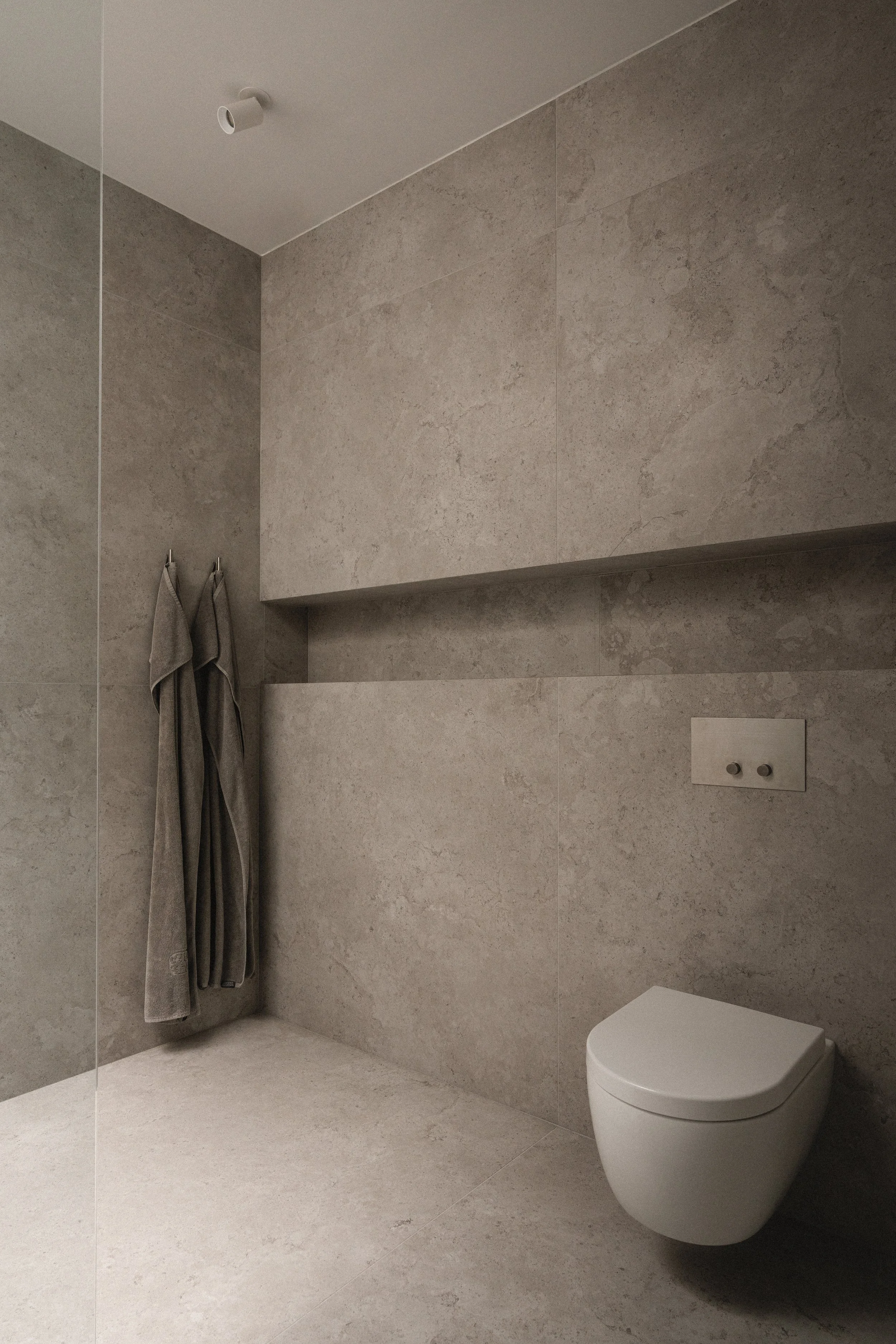 Rene linjer, skjult opbevaring og blid, ton-i-ton harmoni definerer badeværelserne i denne renoverede Amager-villa. De høje, grålakerede skabe er fuldt integreret i arkitekturen og skaber rolige flader med generøs, diskret opbevaring. Fliser og håndvaske fra Living Ceramics , tilgængelige gennem Boform Copenhagen, fuldender det rolige og afbalancerede udtryk.