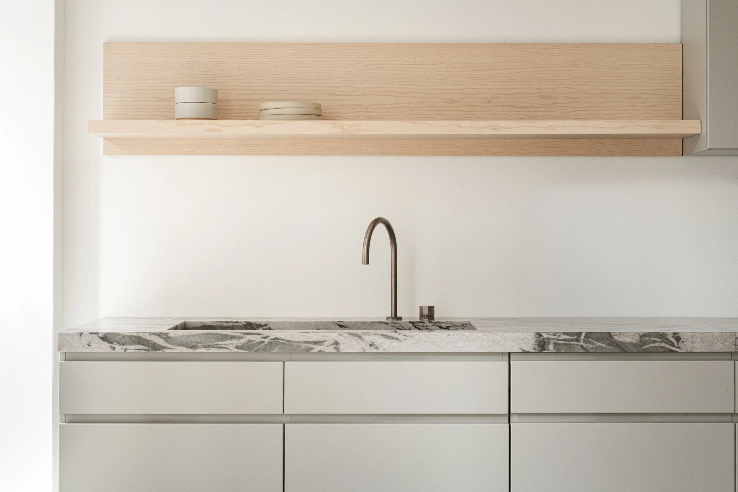 Bordpladen og den integrerede vask med fræst afløbsbakke er udført i ét stykke eksklusiv kvartsit med grønlige årer, der tilfører naturlig dybde og et raffineret spil i overfladen. Indvendigt fuldendes oplevelsen af Boforms signaturskuffer i massiv bøg, i samspil med hvidevarer fra ASKO Nordic og det elegante Déca-armatur fra TONI Copenhagen.
