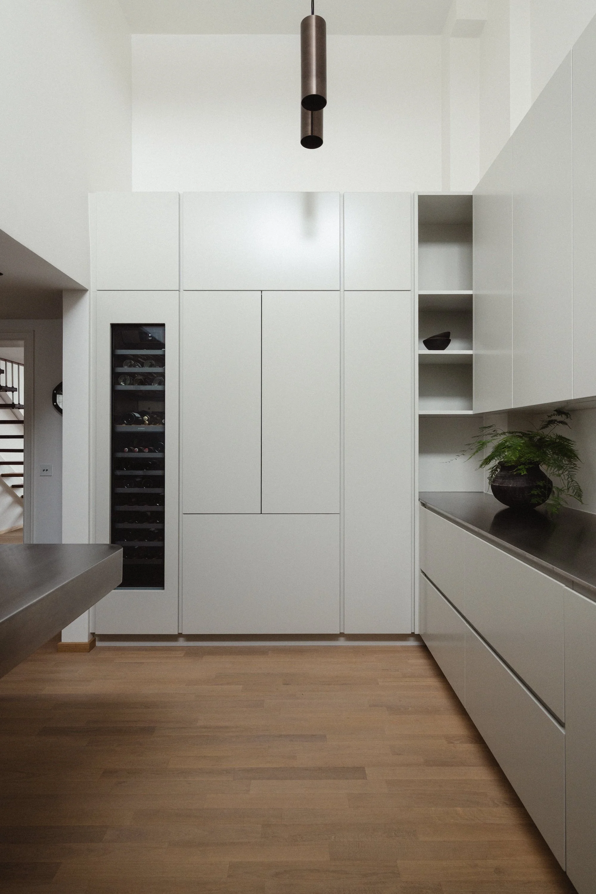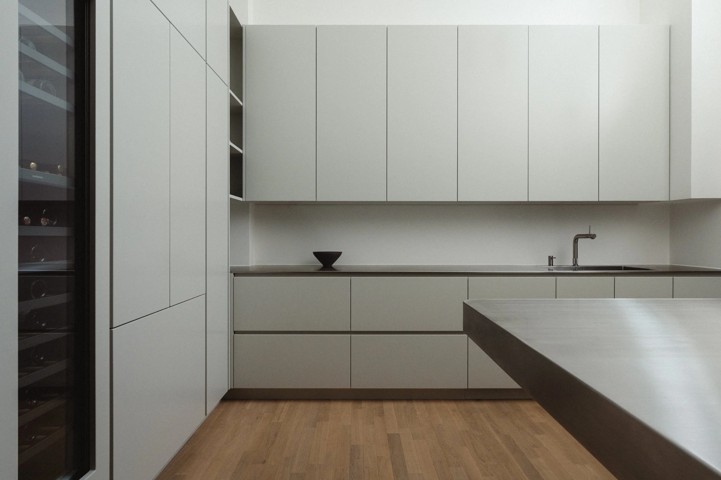 Køkkenet er udstyret med Gaggenau-ovne og en espressomaskine fra Gaggenau Expressive Series, mens det indbyggede vinskab og køle-/fryseskab er fuldt integreret i snedkerindretningen, så det enkle og minimalistiske udtryk bevares.