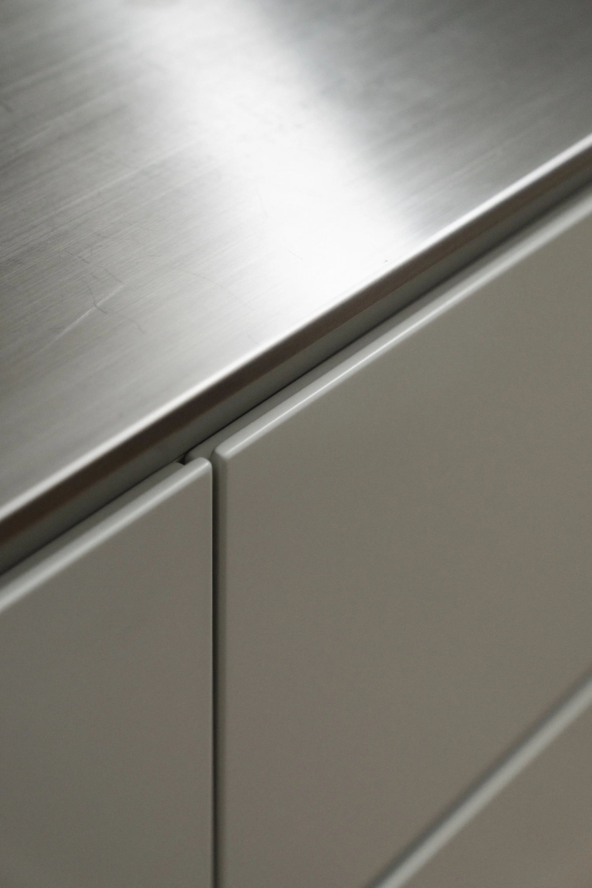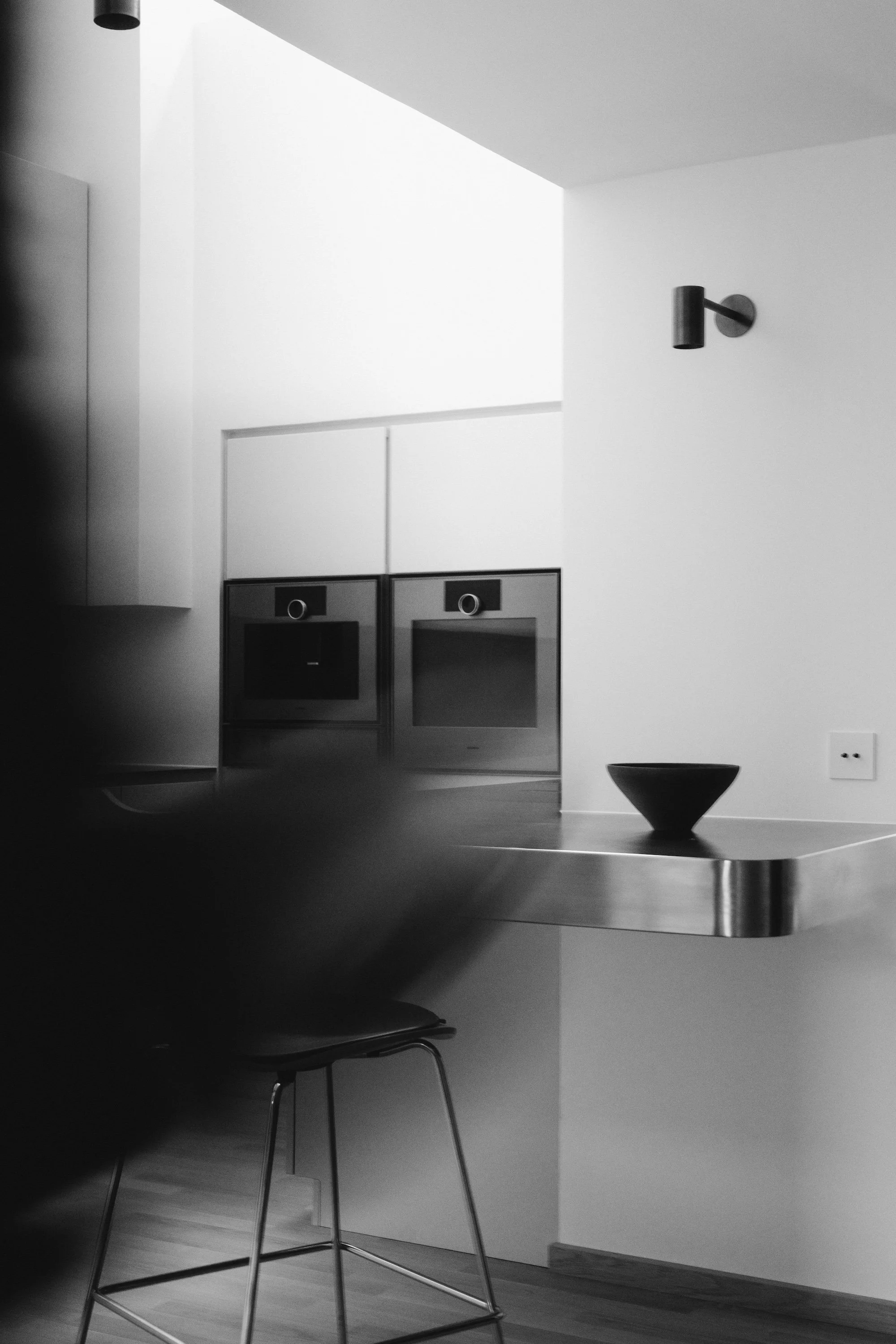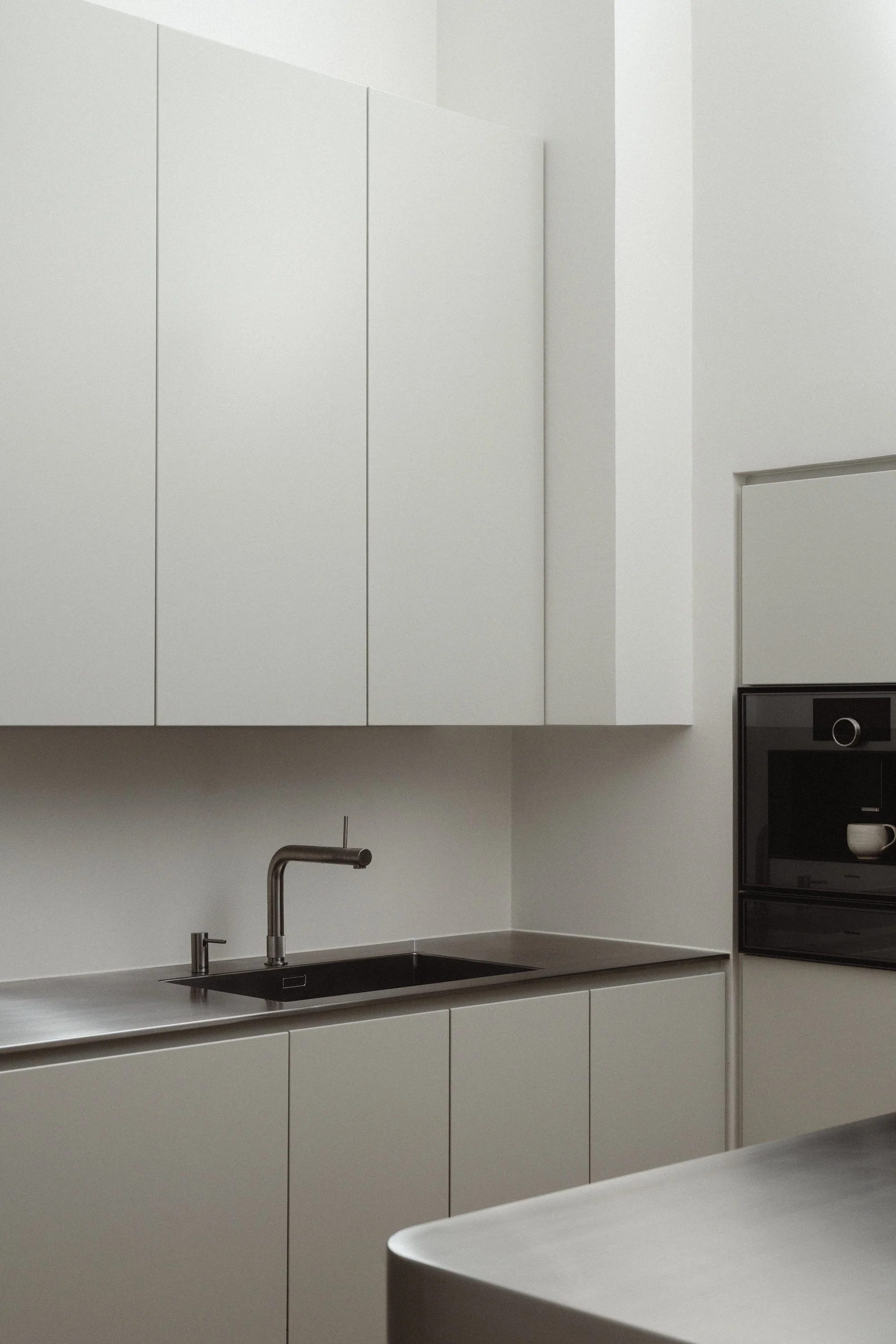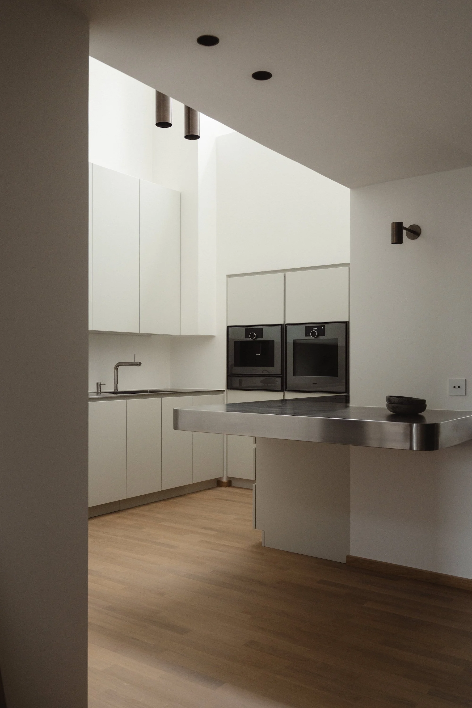 Boform-køkkenet med skabe i lys grå lak og bordplade i rustfrit stål er specialdesignet til rummet og udtrykker en konsekvent minimalistisk æstetik. Indretningen bevarer spor af det oprindelige køkken, nu integreret i et moderne og funktionelt design. Det naturlige lys kommer udelukkende fra et ovenlys, der bader hele køkkenet i lys og fremhæver rummets næsten katedralagtige loftshøjde og volumen. De høje overskabe sikrer en praktisk opbevaringsløsning og understreger samtidig de rene, enkle linjer.