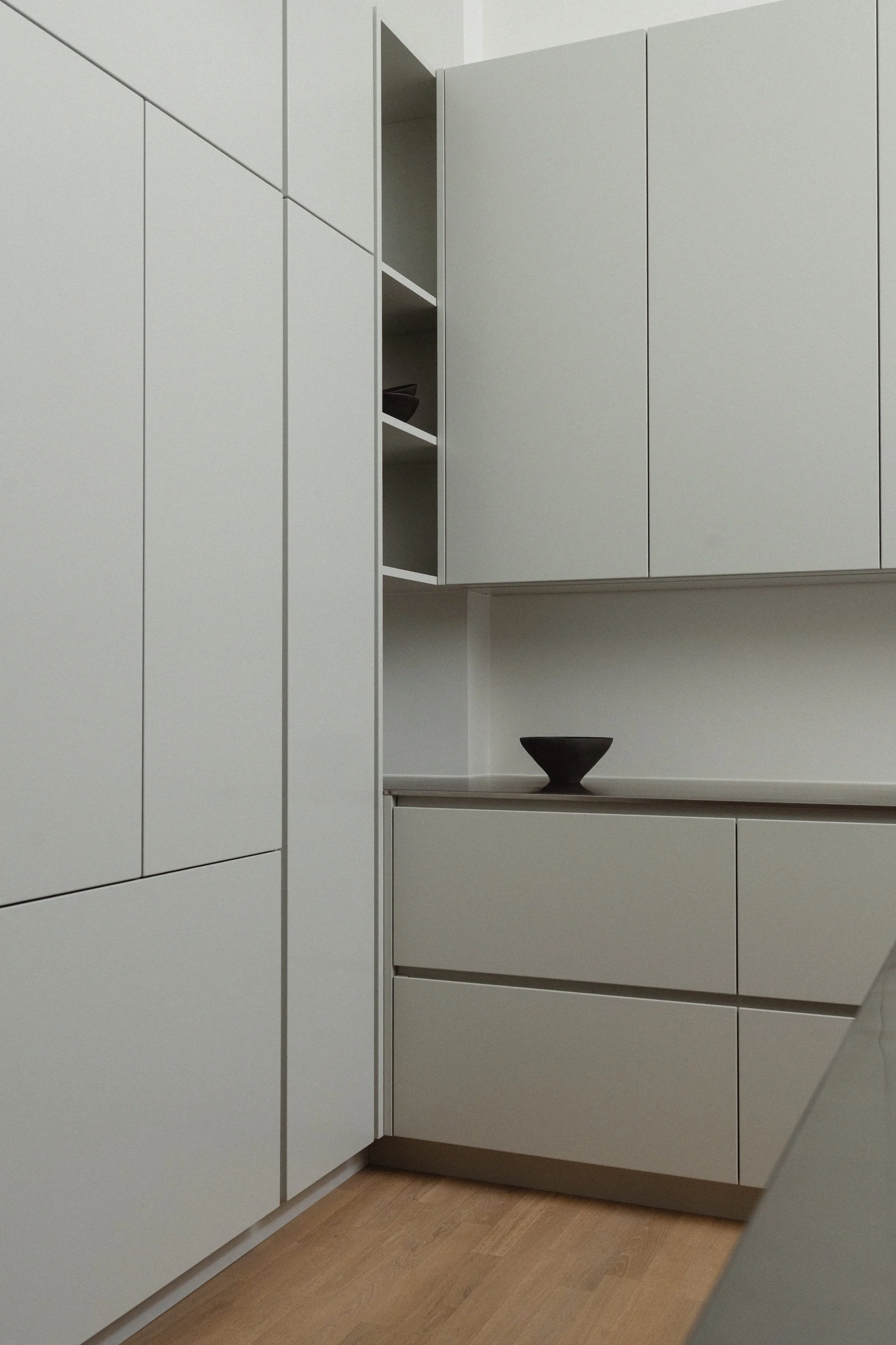 Specialfremstillede skabe med skuffer i Boforms Line-model, udført i blød grå lak med Corian-bordplader og integrerede vaske, giver robuste og praktiske overflader og fastholder de rene, stramme linjer. Skufferne er indvendigt beklædt med Boforms klassiske bøgetræ, som tilfører varme og en taktil kvalitet til rummene.