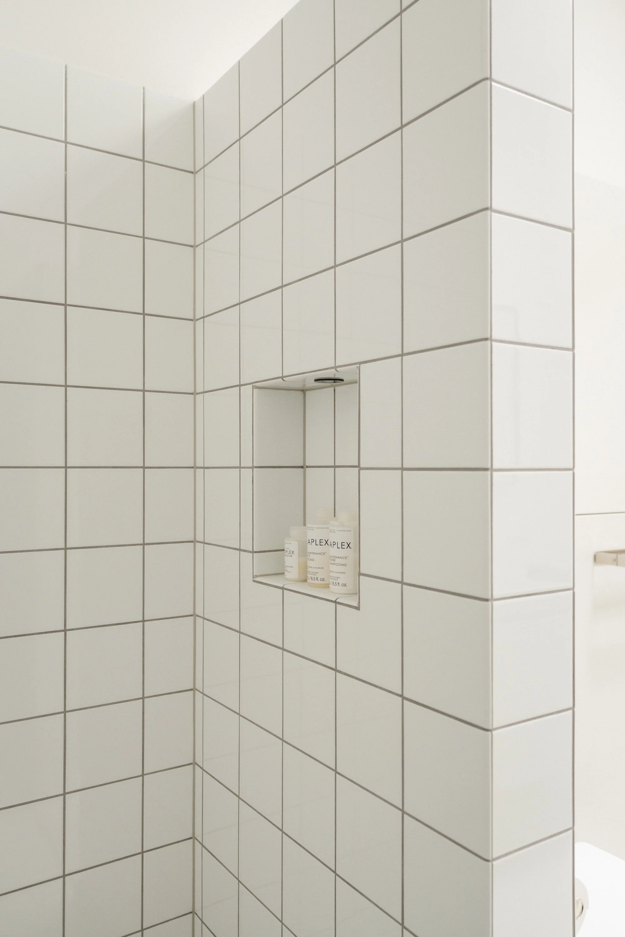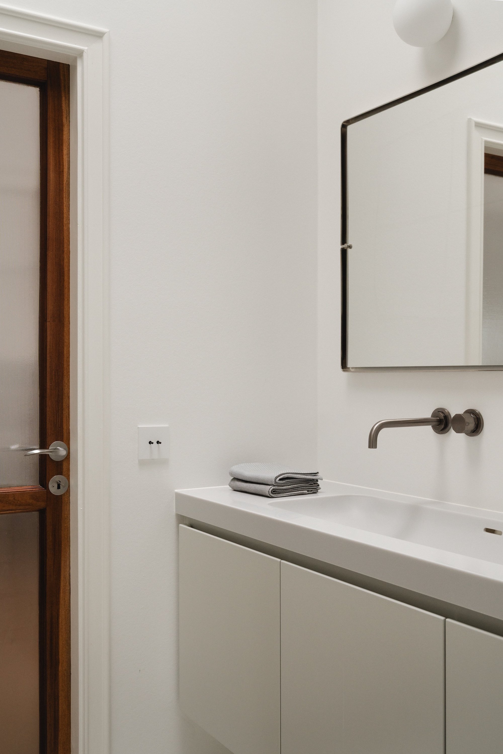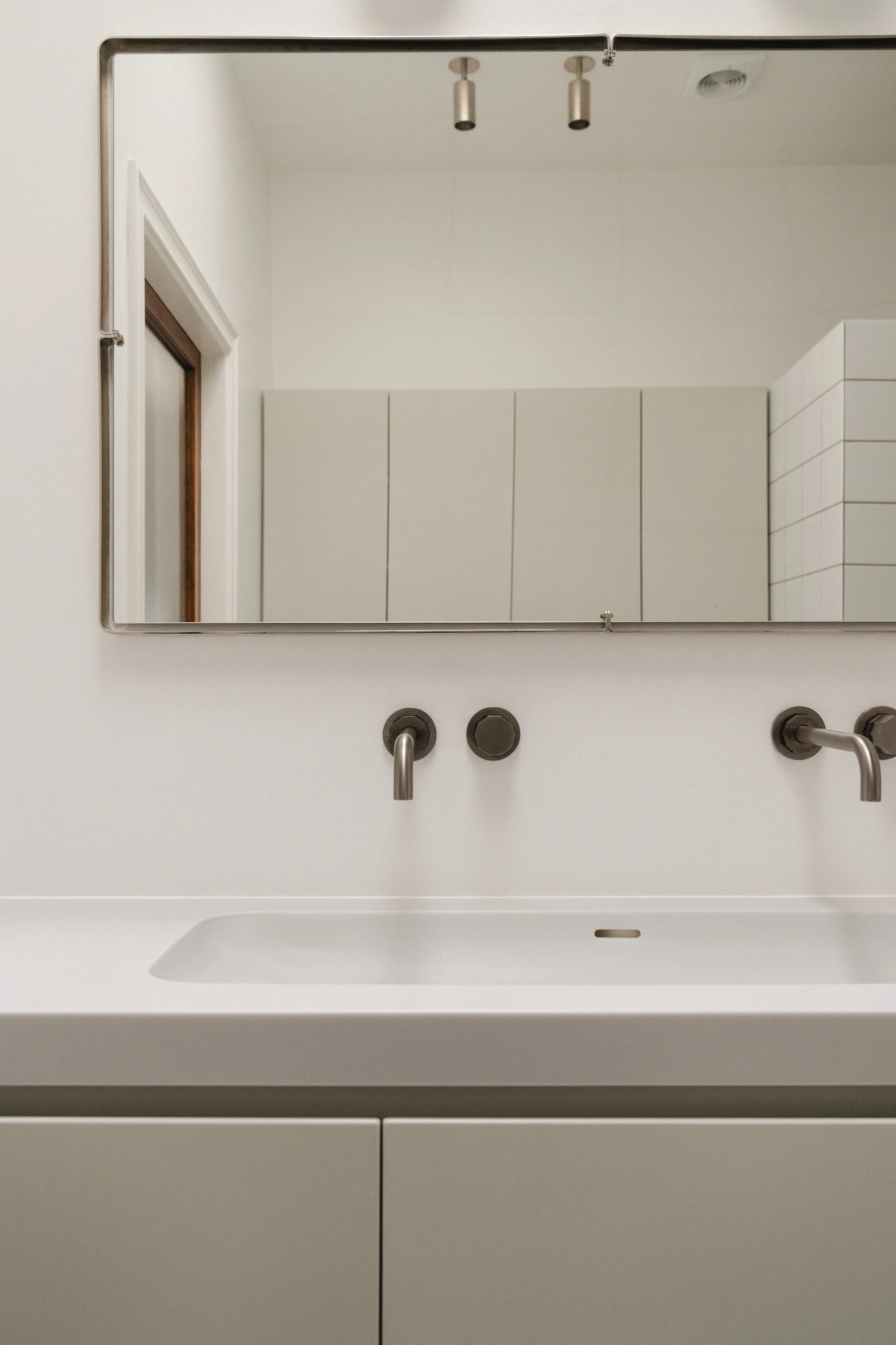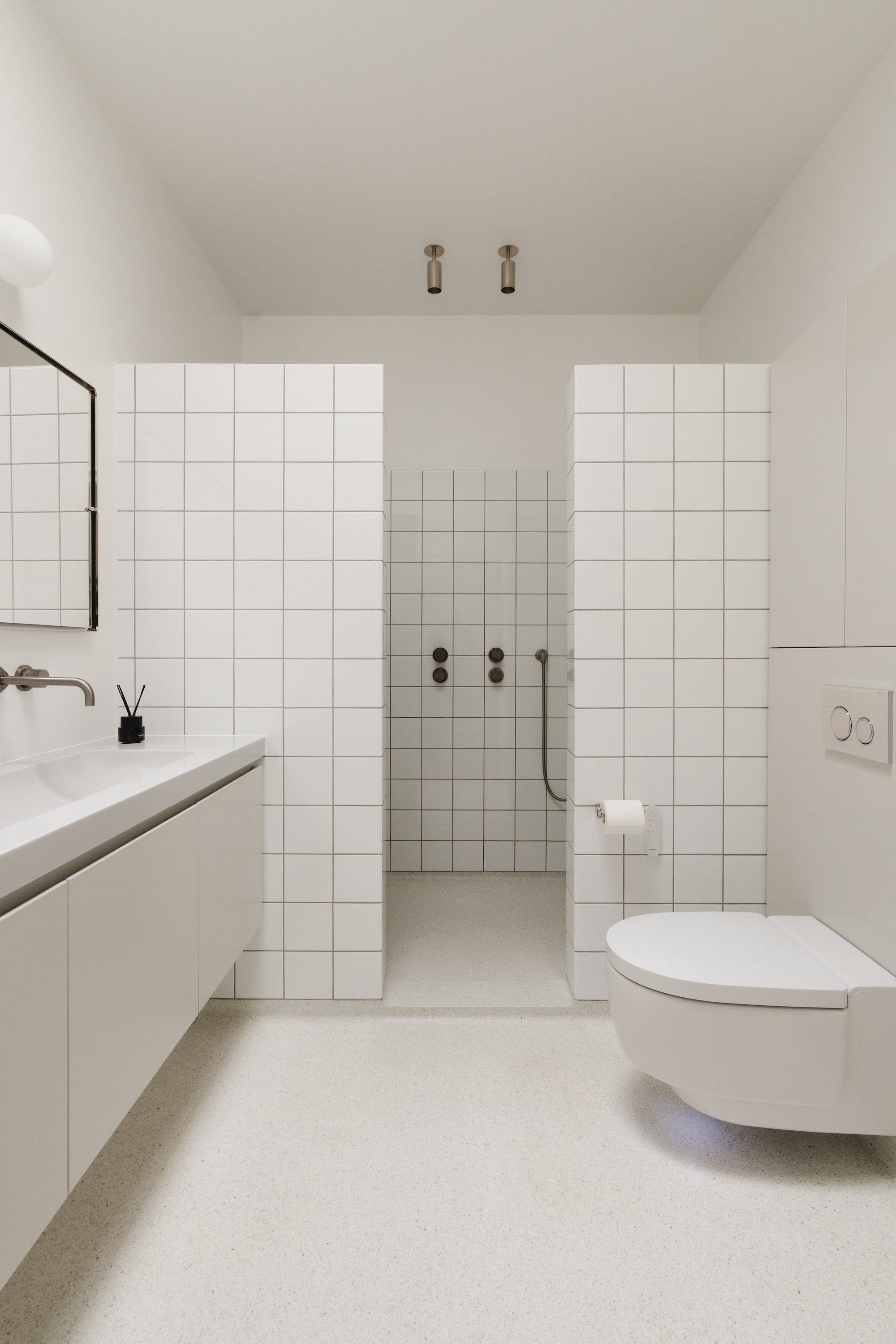 Badeværelserne afspejler den funktionalistiske designtradition med fokus på enkelhed, proportioner og anvendelighed. De er bevidst rå og minimalistiske, med klassiske porcelænsfliser kombineret med terrazzogulve, hvilket skaber en afdæmpet historisk reference og samtidig fastholder et moderne, funktionelt udtryk.