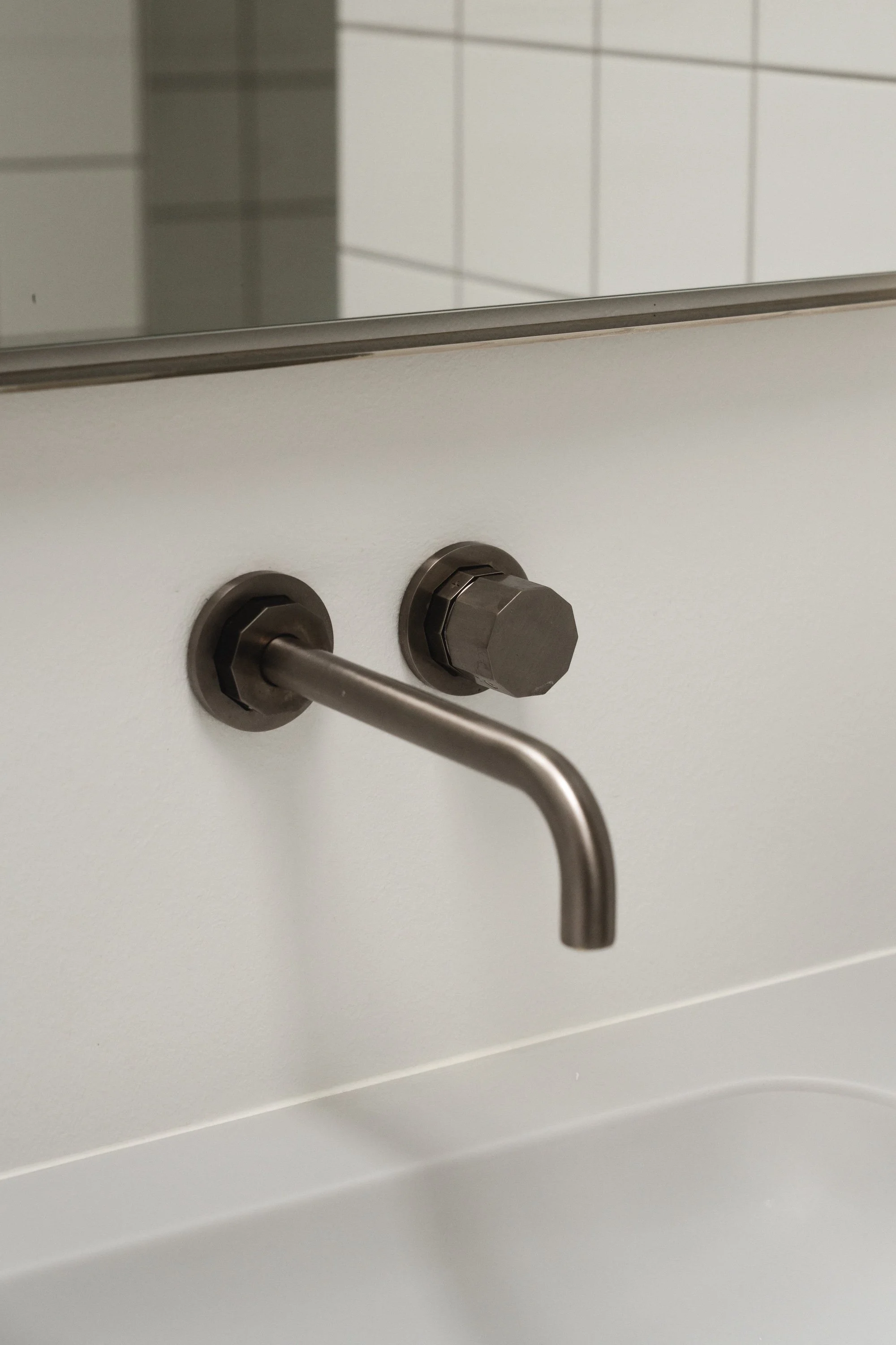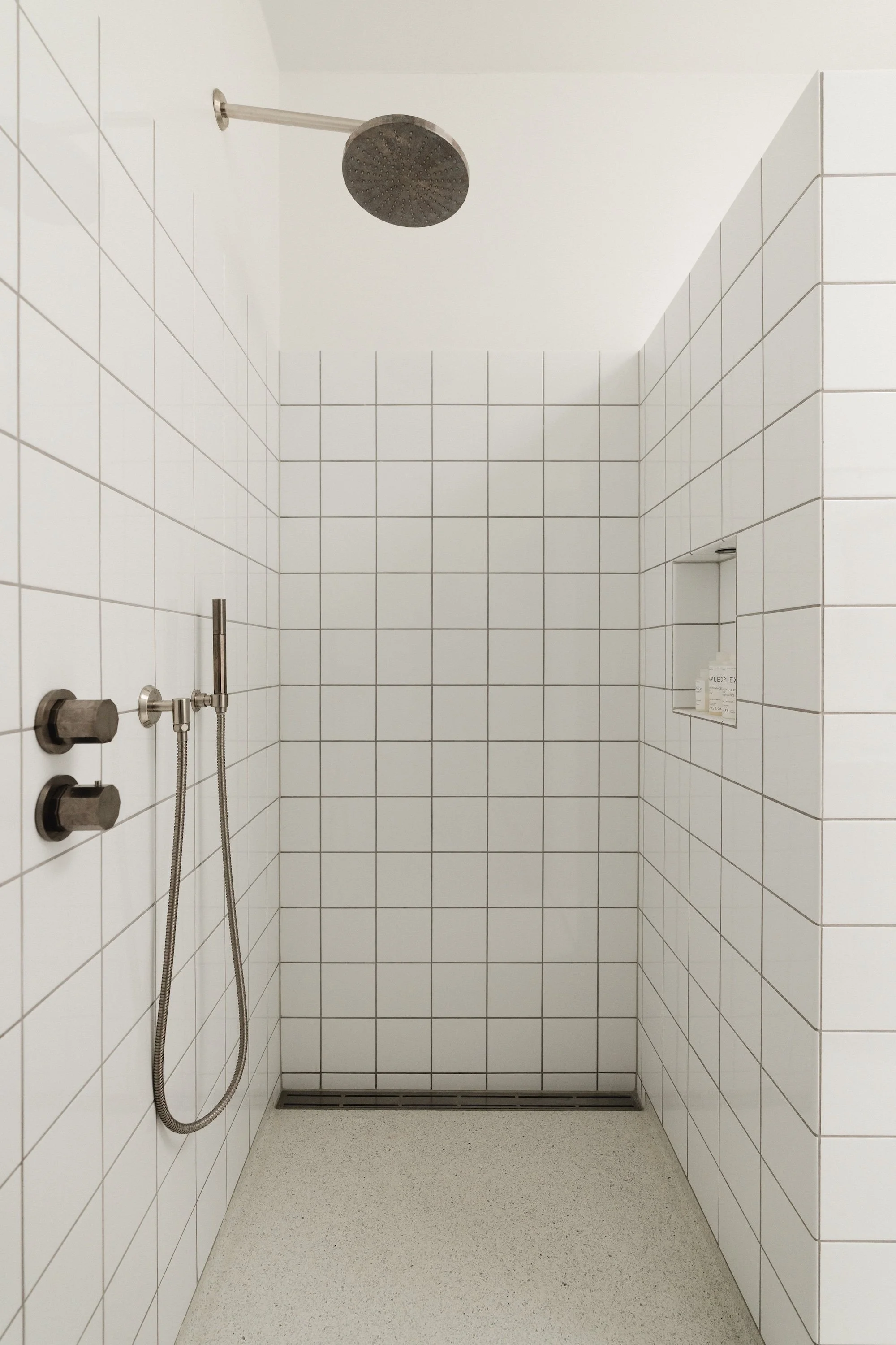 Indbyggede armaturer og brusere fra Toni Copenhagen samt spejle og håndklædestænger fra Déca-serien i børstet nikkel tilfører en elegant kontrast til de mere rå flader. Indbyggede skabe bag toiletterne skjuler cisternerne og skaber ekstra, diskret opbevaring, så rummen fremstår ryddelige og højt funktionelle.