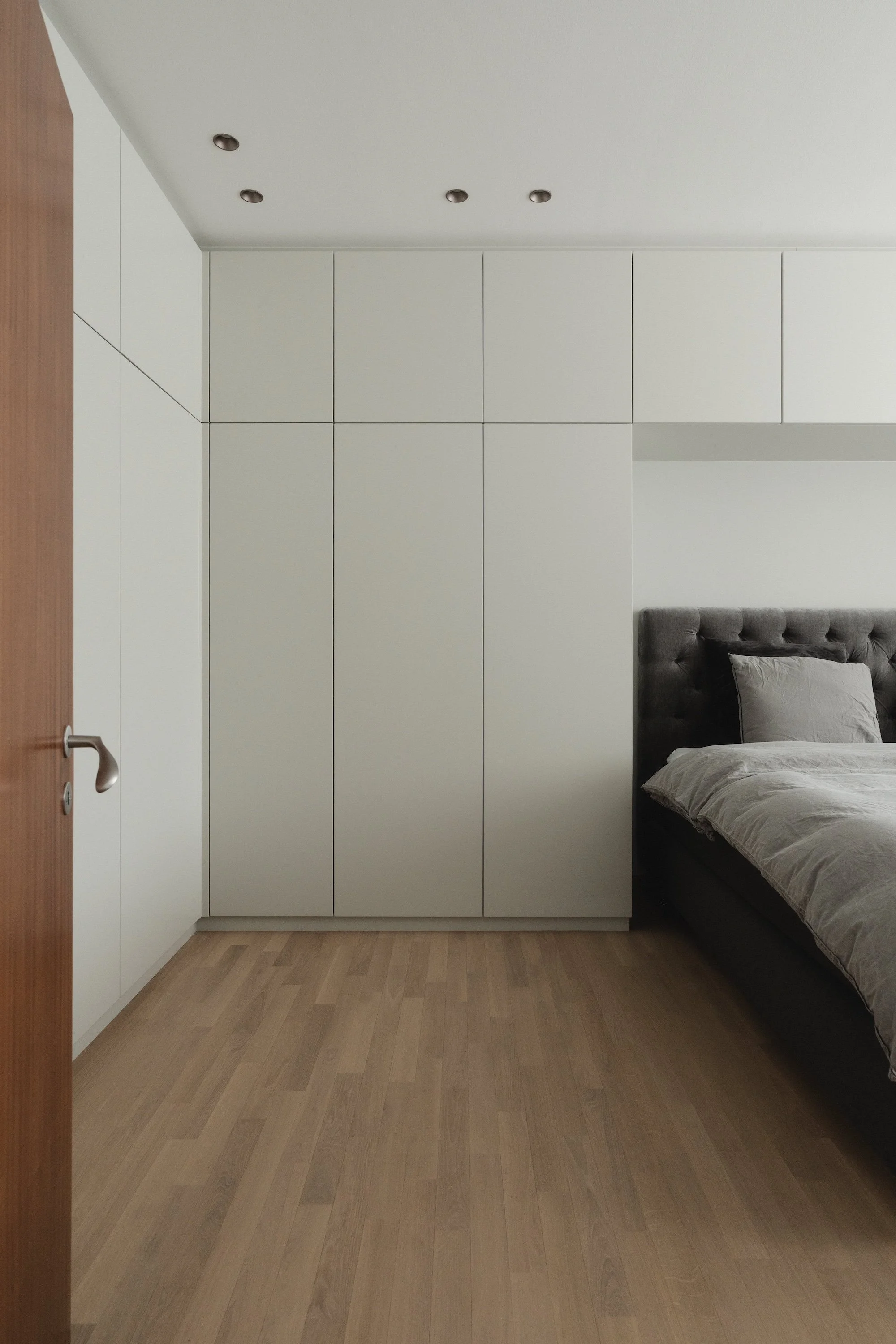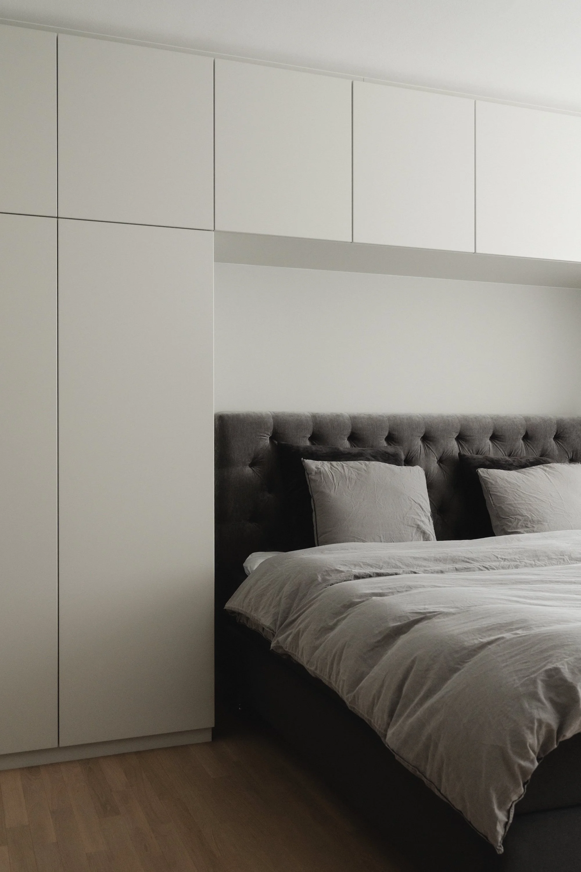 Soveværelset er indrettet med specialfremstillede garderober, der omslutter sengen og integrerer sengebordsnicher, der fungerer som natborde. Løsningen maksimerer opbevaringsmulighederne og udnytter rummet optimalt, samtidig med at det rene, minimalistiske udtryk fastholdes.