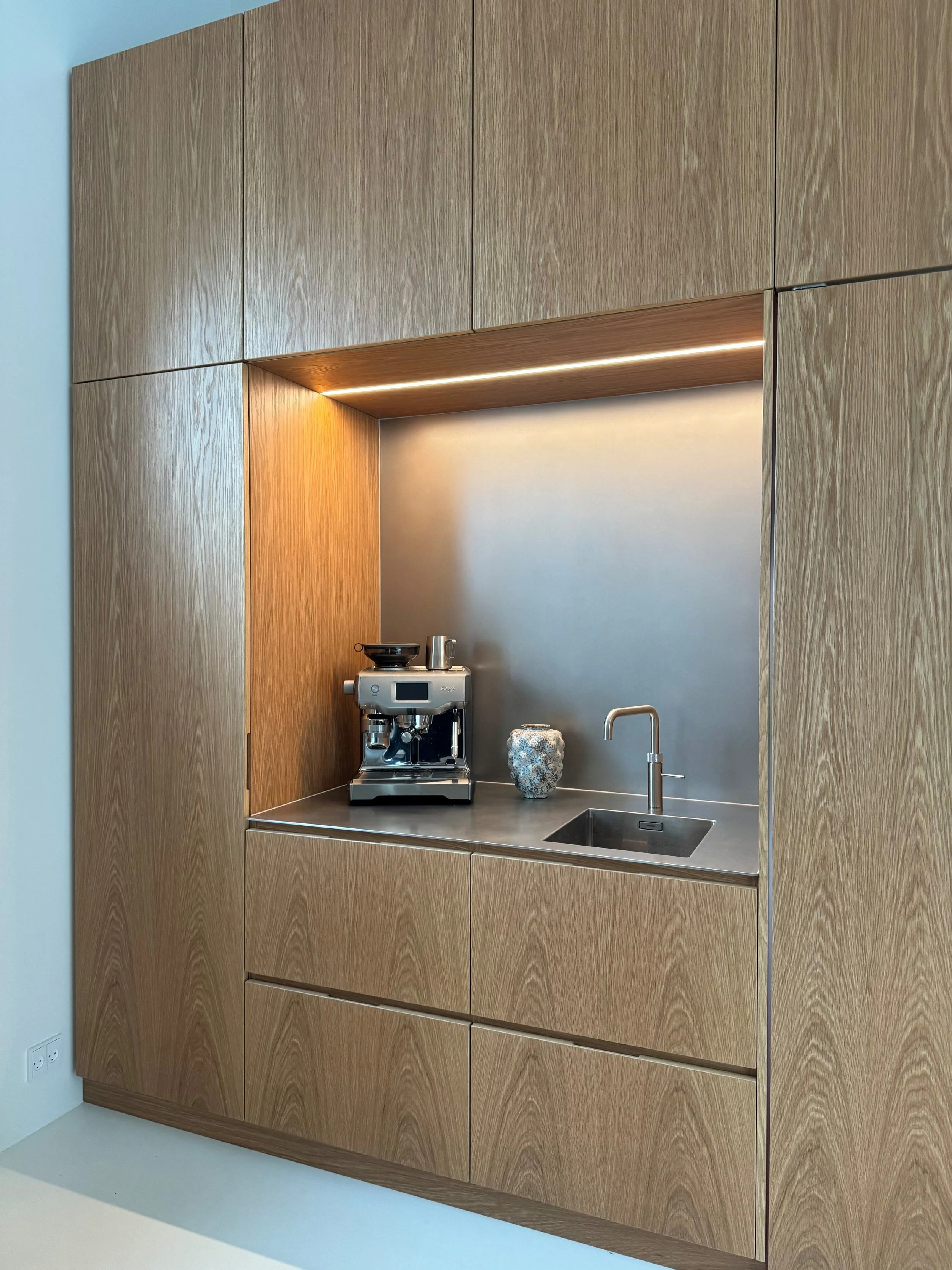 Vores træ og finér bliver håndsorteret, så åretegning og struktur forløber harmonisk på tværs af fronter og skuffer. Hver låge bliver nummereret og fineret i rækkefølge for at sikre et sammenhængende og roligt udtryk. Resultatet er en helhed, hvor detaljer, overflader og proportioner smelter sammen i et balanceret design.